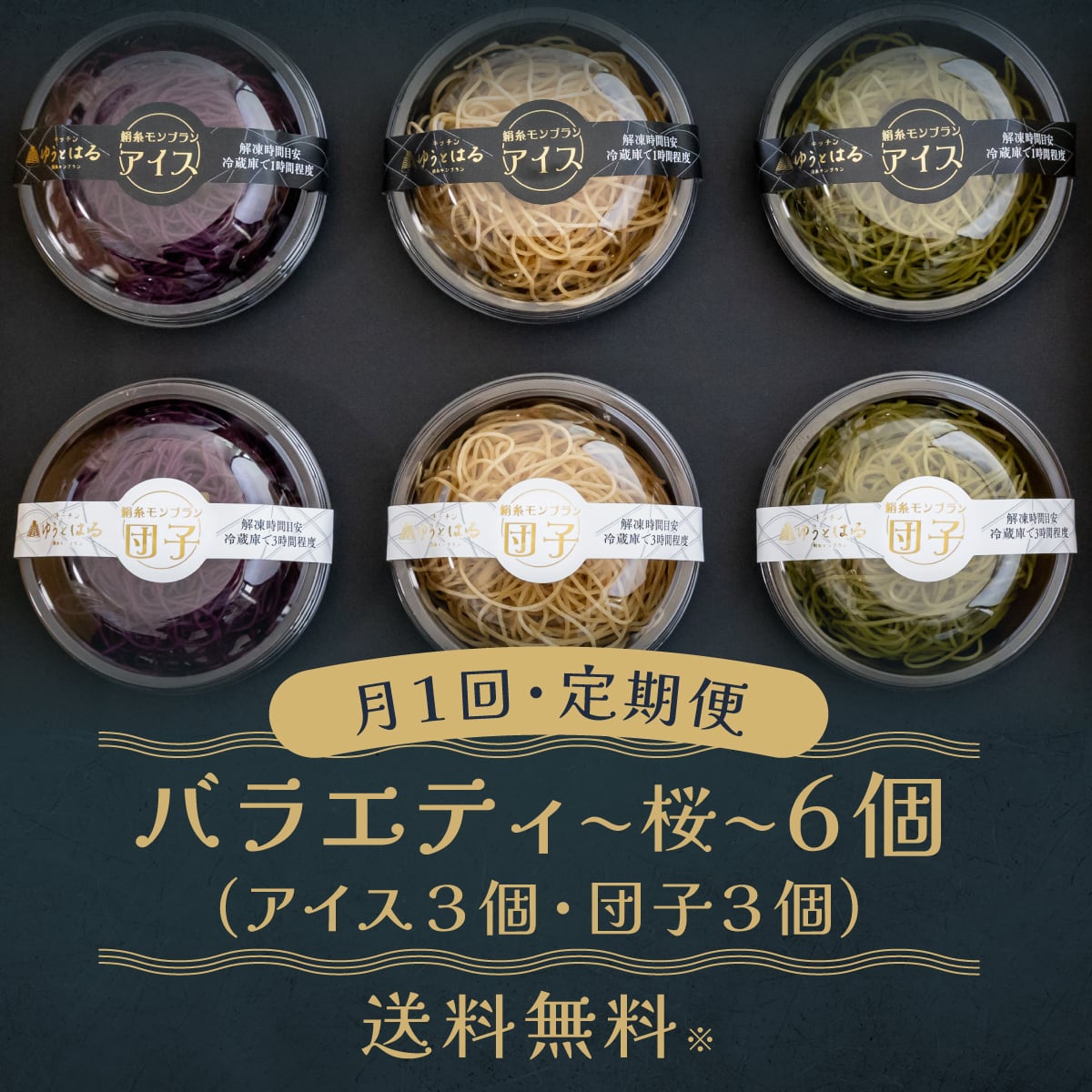 団子、アイス 高級和栗・贅沢抹茶・逸品紫芋 各1個ずつの合計6個セットを毎月お届けします。